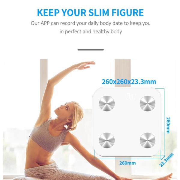 Measuring total 18 kinds data of body: including Weight, BMI, BFR, Muscle Rate, Body Water, Bone Mass, Protein Rate, Metabolic Age, Visceral Fat Index, Subcutaneous Fat, Standard Weight, Weight Countrol, Fat Mass, Weight withiout Fat, Muscle Mass,Protein Mass,Obesity Level.